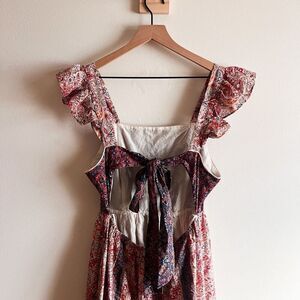 Haute Hippie Boho Fairy Floral Dress in Pink + Purple. Features flutter sleeves, floral paisley pattern, square neckline, tie back, fully lined, & made with pockets. In excellent condition. No holes, rips, or stains. Ours is a smoke free home.