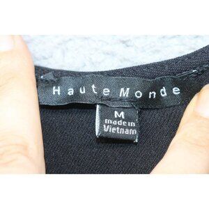 Haute Monde Black Stretchy Jumpsuit-Size Medium-Cut-Out. The material is 78% Rayon, 19% Nylon and 3% Spandex. Laying flat measuring armpit to armpit it is 15'' and measuring the inseam it is 27''.