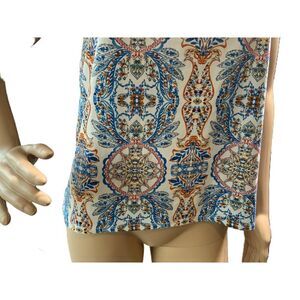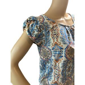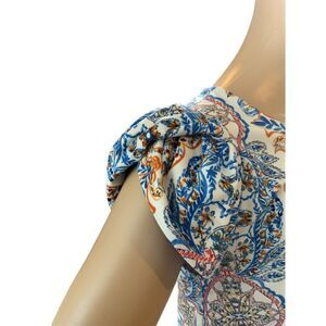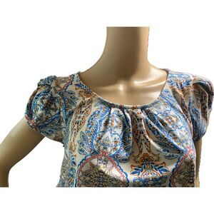 Haute Monde Blue White Orange Patterned Floral Elastic Neck Blouse Size Medium