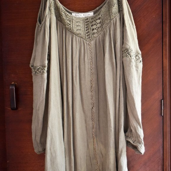 Selling my EUC Haute Monde Cold Shoulder top! It's a beautiful olive green color with detailing down the middle and along the sleeves. Shell 1 is 100% polyester and shell 2 is 100% rayon. Regularly $35, selling for $25 or best offer! If you'd like any more pictures, just let me know.
