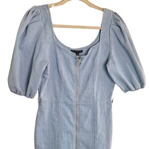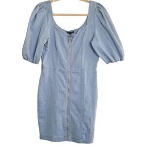Light blue denim mini dress with zipper down front & adorable peasant style poof sleeves