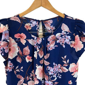 Elevate your casual or workwear wardrobe with this stunning Haute Monde Floral Blouse. The round-neck, collarless, unlined top features pleated chiffon fabric with petal sleeves and a keyhole back closure. The vibrant blue color and floral pattern add a touch of spring and summer to your outfit.