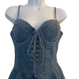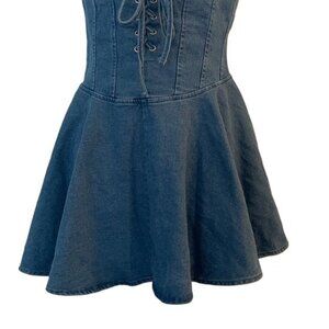 Haute Monde Light Blue Mini Halter Top Lace Up Opening Denim Dress, Small