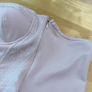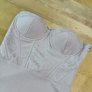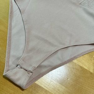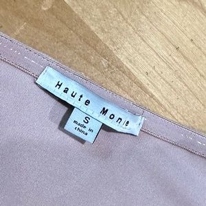 Zipper on side, buttons on bottom. Slight stretch. Nude color.