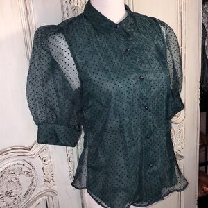 Haute Monde Sheer Dotted Swiss Puffed Sleeve Button Down Blouse Size Small