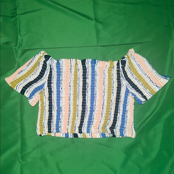 Chic and stylish off-shoulder top featuring a vibrant striped pattern. Perfect for casual outings and summer days.