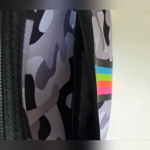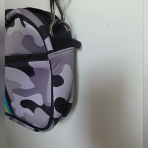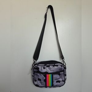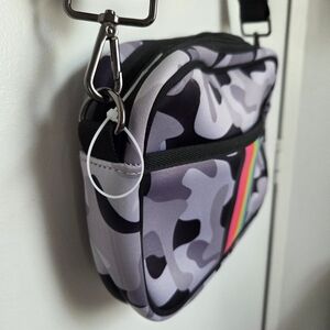 Stylish and versatile camouflage crossbody bag featuring a vibrant rainbow stripe. Perfect for everyday use.