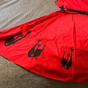 Red and black sundress - decorated with Steinlen style cats along the hem. XS