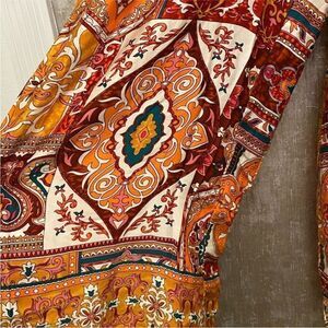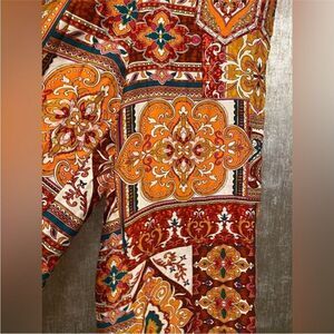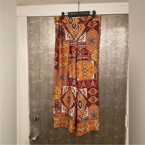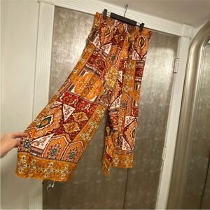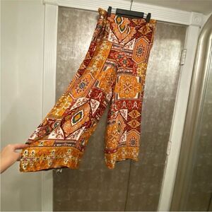 Embrace a bohemian vibe with these vibrant patchwork wide-leg pants. Featuring a stunning mix of red, orange, and yellow patterns, these pants are perfect for making a statement. Ideal for casual outings or a relaxed day at home. New, no tags