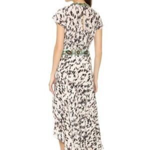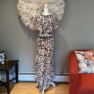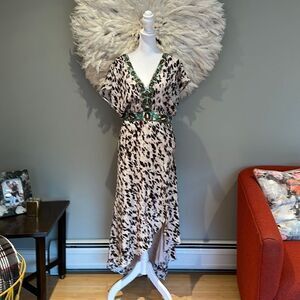 This dress has a deep V neck. Framed with intricate sequins along the V and waist. Hook in back and side zip. Beautiful dress that is a show stopper! Like new