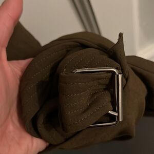 worn once. in excellent condition. 14.5 inches around the waist when clipped. belt is hidden inside pocket. roughly 32 inches from top to bottom.