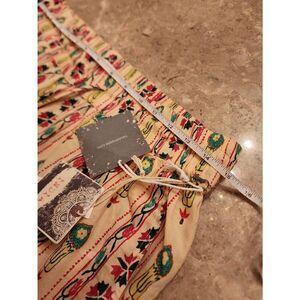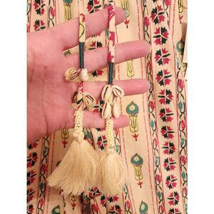 Stretch waist, string detail includes seed beads and shells, India style coloring, crochet detail at hem