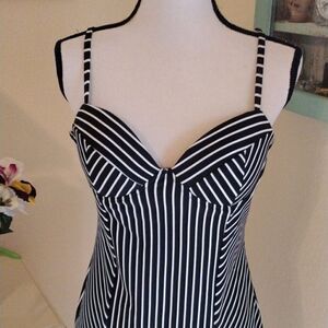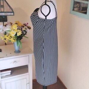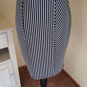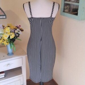 Stripes define this dress. A vertical panel down the front. Diagonal stripes are fashioned to flatter your waist. Built in bra, and a bra bodice. Adjustable straps. Size L measures 38 at chest, 30 at waist, 36 at hips, 32 at bottom hem for a perfect pencil shape. This dress makes YOU special.