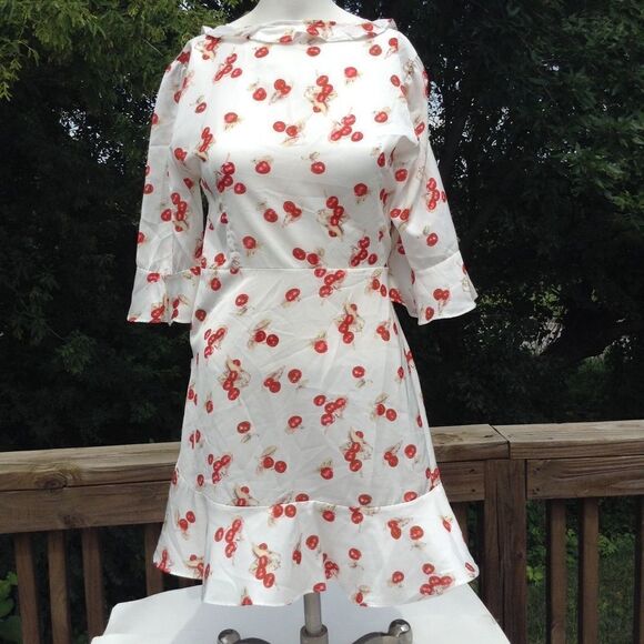 Haute Rouge White Cut Out Mini Dress Red Cherry Print Halter Size Small