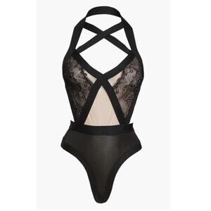 Mesh and lace and the geometry of straps combine on this intriguingly alluring teddy.