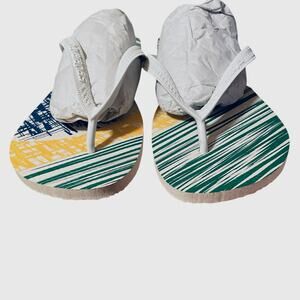 Step into these rare, retired Havaianas Brazil logo flip flops! Featuring the iconic Brazilian flag design in vibrant blue, yellow, and green.