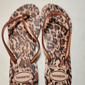 Havianas; size 11/12 Chic animal print sandals. Features bronze straps. Ideal for everyday style.