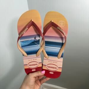 The Top Surf Sessions is our tribute to the journey of surfers who spend their days on the water, from sunrise to sunset, and know that every moment on a surfboard is different. These stylish mens flip flops feature a Thomas Fotomas artwork on the soles and sides with a surfer in the water, plus two-tone straps (one color on top and one on the bottom) and the Havaianas logo in a pop-up color. Sick Kauai surf.