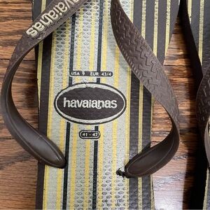 These are men's Havaianas flip flops. They show minor wear on the bottom but are still in great condition. They are a size 41/42, equivalent to a US 11/12.