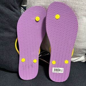 Fun Havaianas flip flops with a purple cat print. Bright yellow straps add a pop of color. Size 41/42.