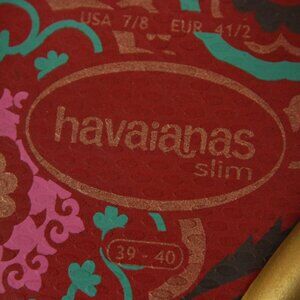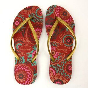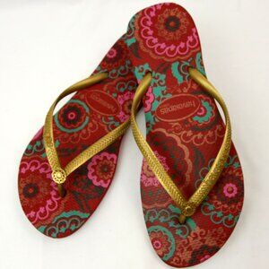 Havaianas Slim Red Floral Gold Straps Flip Flops Thongs Sandals 7 8 Beach Casual