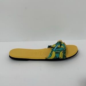 Flat slide sandals with a yellow bottom and tropical banana fabric strap