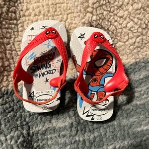 Let your child step into adventure with these Havaianas Spider-Man flip flops. Featuring a vibrant red design, these sandals are perfect for young superhero fans. Excellent used condition, sadly my son outgrew them. Only worn inside. Toddler/Baby size 5c. Smoke free, pet free home.