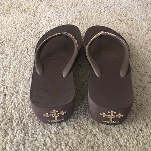 Havaianas high sandals with Swarovski crystals sz 7 (there is some missing crystals in the front but easily replaced). In like new condition. Comes with some extra crystals.