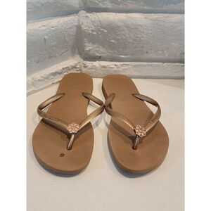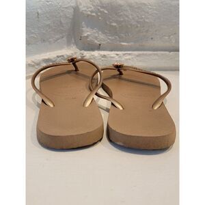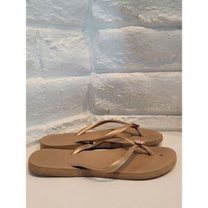 Pre-Owned Havaianas womens slim flip flops size 9-10. Flaws- burn mark on right front of shoe- slight back wear on bottom of sole see pictures above.
