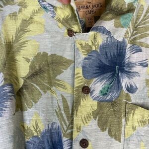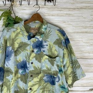 Havana Jack Cafe Blue flower Hibiscus Floral Hawaiian Tropical Silk Button Down