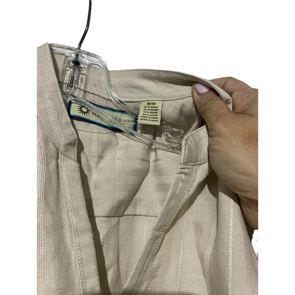 Havanera Men's Button Down Shirt Deep V Neck Stripes Cream Tan Size Medium