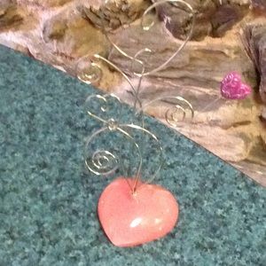 Heart photo or card holder. Will hold 5 items. The base is heart shaped in pink with a small heart ornament