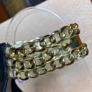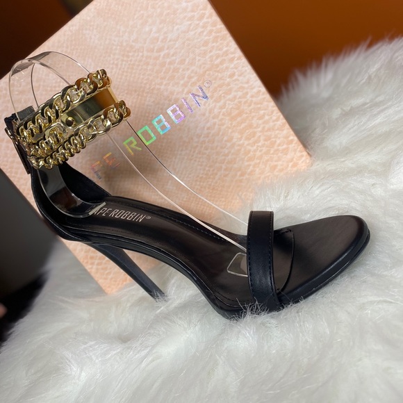 This open toe heels has gold chains and black strap is the perfect choice for any occasion.