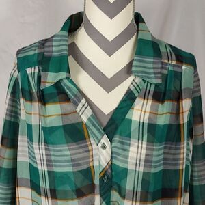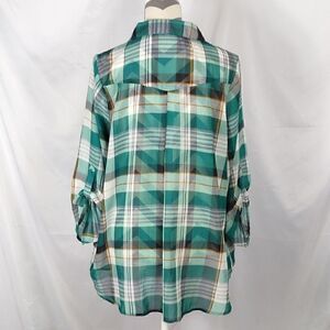 This Have simi sheer green plaid long sleeve button down blouse is a size 2X. It has roll and button sleeves. 100% polyester and machine washable. Pre-owned and in like new condition. All offers welcome.