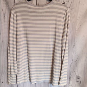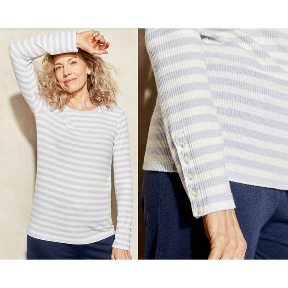 "A tee with a soft touch. This stripe tee with button detailing at the sleeve elevates an everyday essential. Layer it up and wear on repeat."
