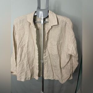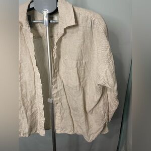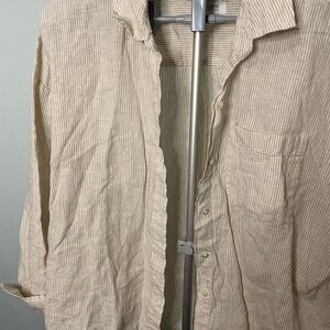 Tan and white striped linen button up shirt