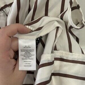 The Haven Well Within Washable Silk Chemise Nightgown Lingerie in size M features a stylish brown striped pattern, sleeveless design, and a slip-on closure for convenience. Made from 100% silk fabric, this lightweight chemise is perfect for the summer and spring seasons. It includes pintuck detailing at the front, adjustable spaghetti straps, and a wide hem for a comfortable fit. Additionally, the elastic smocking at the upper back provides added flexibility, and it is recommended to wash in a laundry bag with cold water and gentle cycle, then hang to dry.