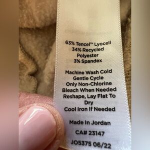 This is super soft and so comfy. This line feels awesome on. The materials are poly, lyocell, and spandex. So it has stretch and is relaxed at same time.