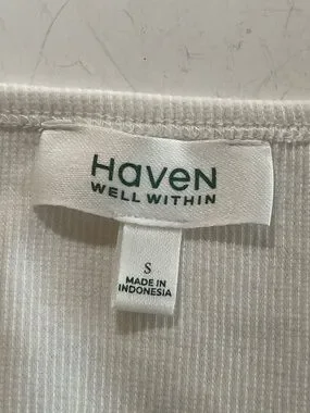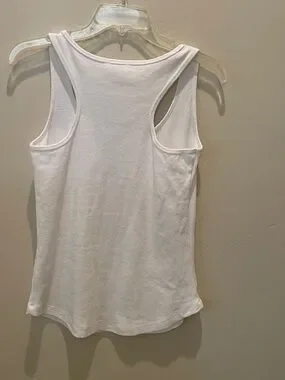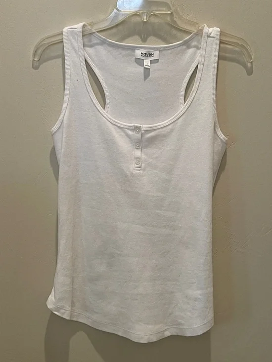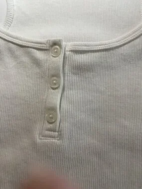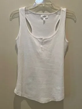 Sleeveless ribbed tank with a three-button henley placket. Soft, breathable knit ideal for layering or warm days. Classic scoop neckline and fitted silhouette. Size S. 16” pit to pit. 23 1/2” from back of neck to hem.