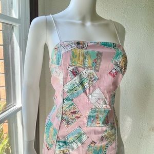 Pretty midi dress in post card fabric with sequin and beading detail. Has piped detailing down the front and a hook & clasp closure. Excellent used condition Size L Pink/blue/white/yellow