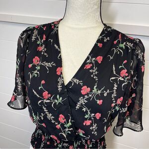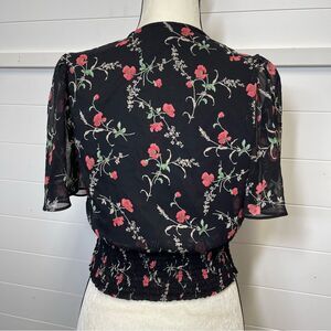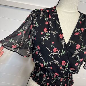 Beautiful black blouse with pink floral pattern. Features a smocked waist and sheer sleeves. Great for party wear, date wear, dinner wear, weekend wear, work wear.