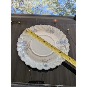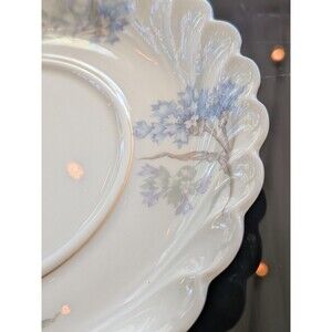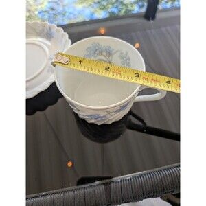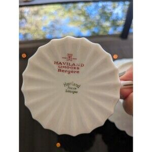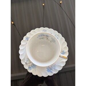 This Haviland Limoges Bergere France tea cup and saucer set from 1990 features a beautiful blue floral design both inside and outside the tea cup on fine bone china. The saucer is beautifully painted and has a ruffled/scalloped edge. The round set includes a tea cup with a handle, perfect for hot beverages, and a matching saucer. This vintage set is decorated with gold accents and a glossy finish, making it a stunning addition to any tea party or sophisticated dining experience. Made in France with an art pottery production style, this set exudes elegance and charm.