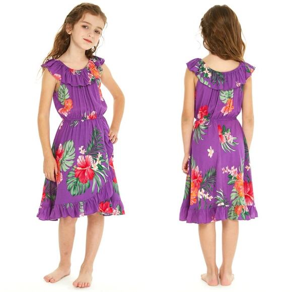 Hawaii Hangover Hibiscus Floral Print Wrap Ruffle Dress Pretty Tropical Purple