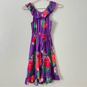 Hawaii Hangover Hibiscus Floral Print Wrap Ruffle Dress in Pretty Tropical Purple, Size 8. Good used condition, only worn a few times. Elastic collar and waist. Pull on style. Please note there is a small snag on the top front right (see last photo for close-up and details). First photo is a stock photo to show fit and detail only.