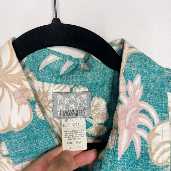 Hawaii ID Mens L Teal Green Pink Reverse Print Floral Aloha Shirt Button Front