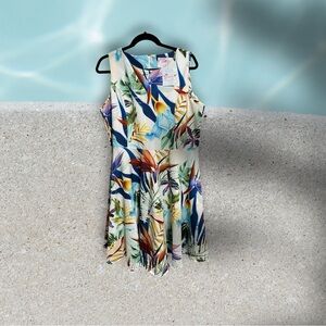 Vibrant sleeveless dress with a tropical floral pattern. Perfect for summer outings.