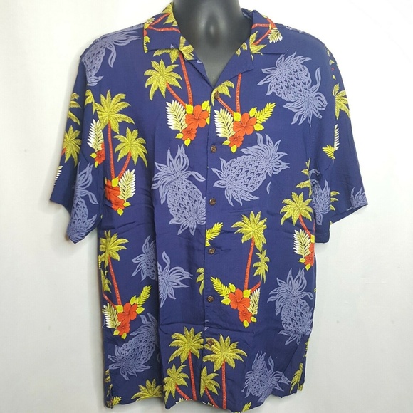 Wingo Hawaiian Aloha Rayon Navy Shirt Button Front Sz L Pineapples Palms Pocket