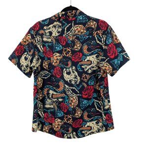 Hawaiian Button Down Men Shirt Size M Skulls Roses Dice Allover Print Retro Art