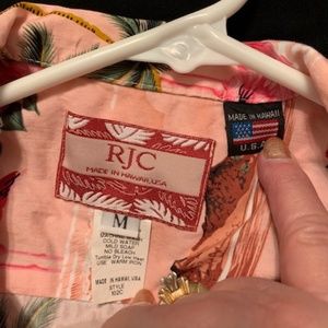 Beautiful Pink shirt with flamingoes, palm trees and plumerias. Fabric content is 100% cotton. It is a size Medium. Brand new condition with no rips tears or stains. This shirt was made in and bought in Hawaii. Smoke free but pet friendly home.