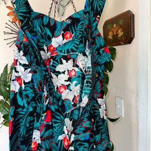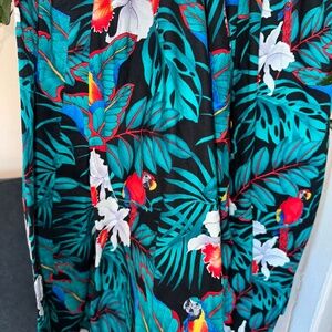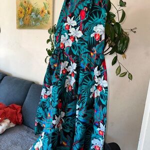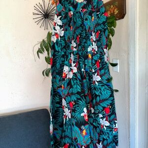 Very pretty Hawaiian dress. Fitted bodice, back is elastic. Sleeveless with zipper and back. Fit in flare style that is fallen. Cotton, vibrant colors, preowned. Very good condition.